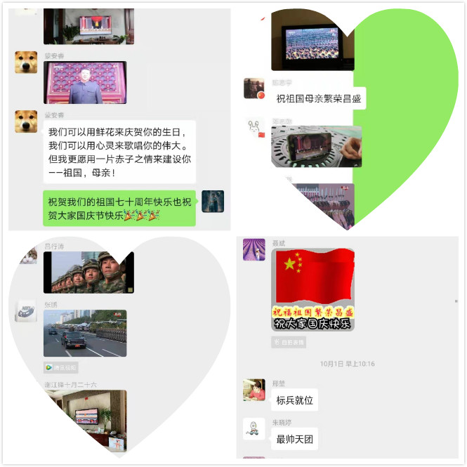 10月1日10時許,天安門廣場花團錦簇,旌旗飄揚,同學們守在電視、電腦、手機前準時收看這氣吞山河、激動人心的歷史時刻,同學們紛紛發截圖,抒發此時此刻激動的心情。習總書記在天安門城樓上發表重要講話說到:沒有任何力量能夠撼動我們偉大祖國的地位,沒有任何力量能夠阻擋中國人民和中華民族的前進步伐。還說到:中國的昨天已經寫在人類的史冊上,中國的今天正在億萬人民手中創造,中國的明天必將更加美好。聽完習總書記的講話,同學們深受鼓舞,信心倍增。