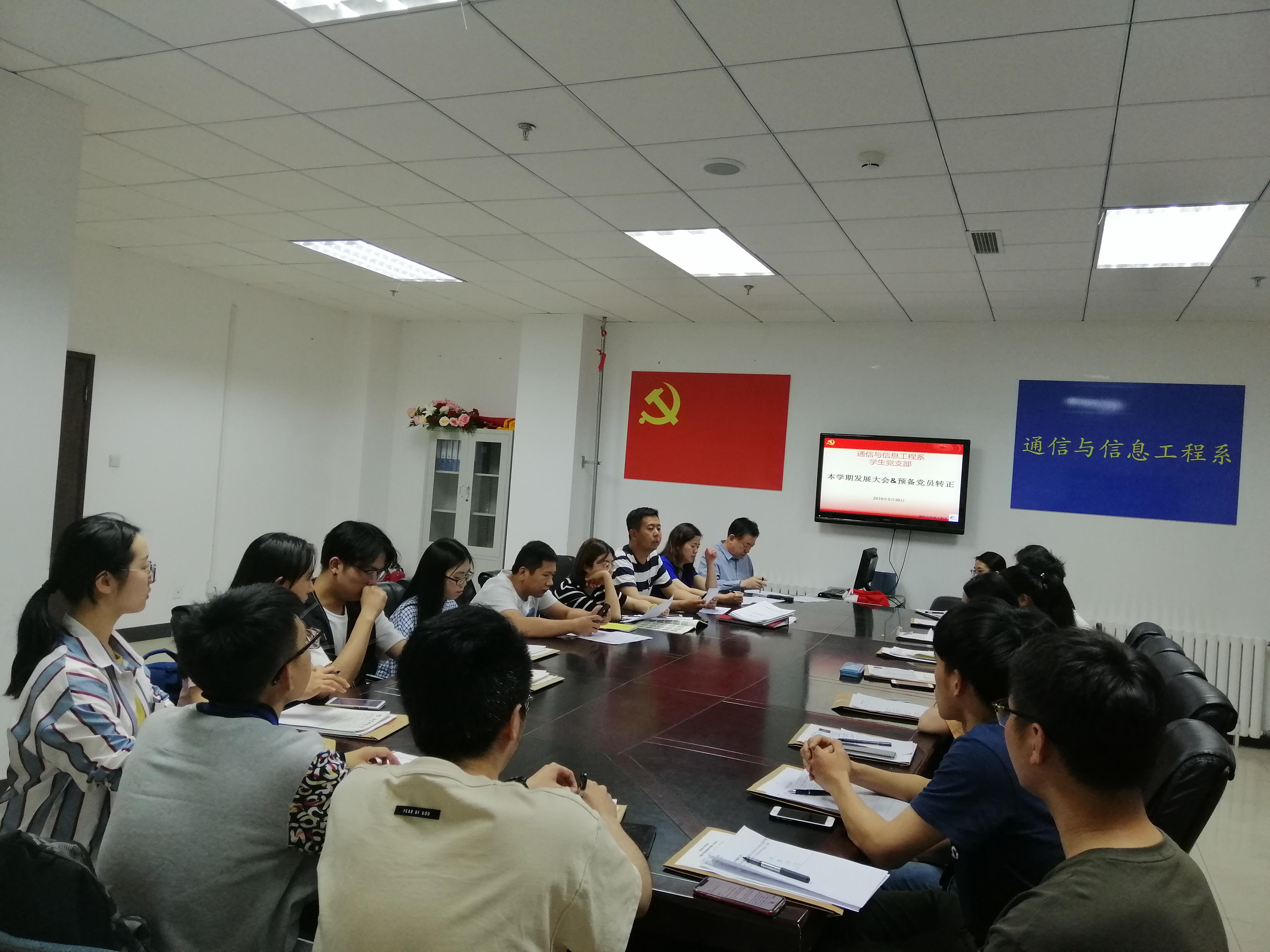 通信與信息工程系學生黨支部于2019年5月30日,在明德樓221會議室召開了通信系學生黨支部本學期發展大會,本次大會主要圍繞通信系學生黨支部發展預備黨員,組織討論并通過馬卉同志、孫姍同志、李明玉同志、杜野同志、孫雨晴同志、劉函嘉同志、吳越同志、邱吉榮同志以及張凌碩同志的入黨申請。通信系學生黨支部書記馮舒同志主持會議。