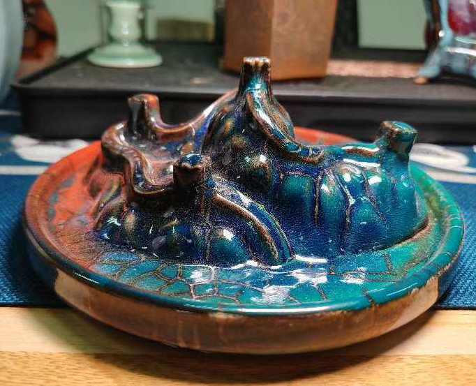 香插采用國家級非物質文化遺產鈞瓷技藝,圓形折沿盤樣式寓意團圓、圓滿。盤底有萬里長城盤旋在江山之上,氣勢磅礴,威武壯觀,可以做香插,還可以當做筆架使用。