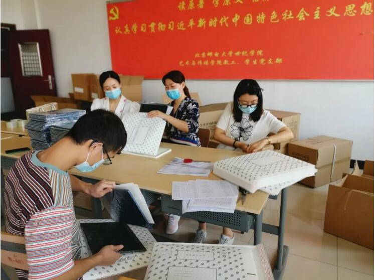 整理行李還未完全結束,又要抽調出人員為畢業生分裝畢業證、學生證等重要材料。疫情防控下的特殊畢業季,已成為“特殊畢業‘寄’”,個人物品代為打包郵寄成為了離校系列工作中最為繁重的任務之一,傳媒院教師黨員同志和老師們親自上陣,幫助同學們打包行李,以這種特別的方式送別2020屆畢業生,傳遞師生情誼,送上真摯祝福。