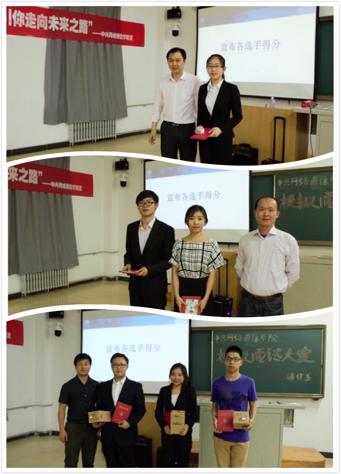 活動(dòng)最后,通過評(píng)委打分,評(píng)出6名獲獎(jiǎng)同學(xué),分別是一等獎(jiǎng)梁爽,二等獎(jiǎng)俞思遠(yuǎn)和夏冬,三等獎(jiǎng)李珍、李浩良、楊斯宇,評(píng)委老師為獲獎(jiǎng)同學(xué)頒獎(jiǎng),且中興通訊公司將在今年暑假為本次獲獎(jiǎng)的6名同學(xué)提供實(shí)習(xí)崗位,至此本次“中興杯“模擬面試大賽活動(dòng)圓滿結(jié)束。