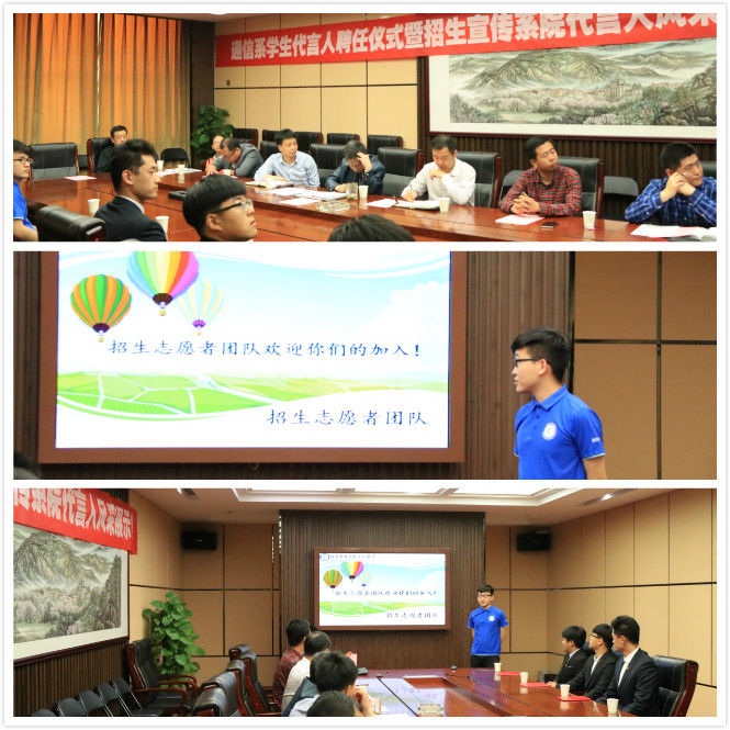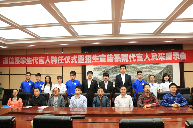 5月10日,通信與信息工程系聯合學院招就處,舉行通信系學生代言人聘任儀式暨風采展示會。學院招就處處長宋向陽、副處長王帥,通信系副主任沙招友及相關教師,招生志愿者團隊學生代表參加了本次活動。