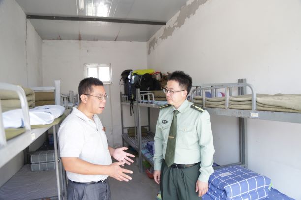 緊接著領導一行跟隨著教師們的步伐來到學生宿舍,通過與值班同學面對面的交流更深入地了解同學們在軍訓基地的感受,并對醫務室內的醫生及學生進行了慰問。