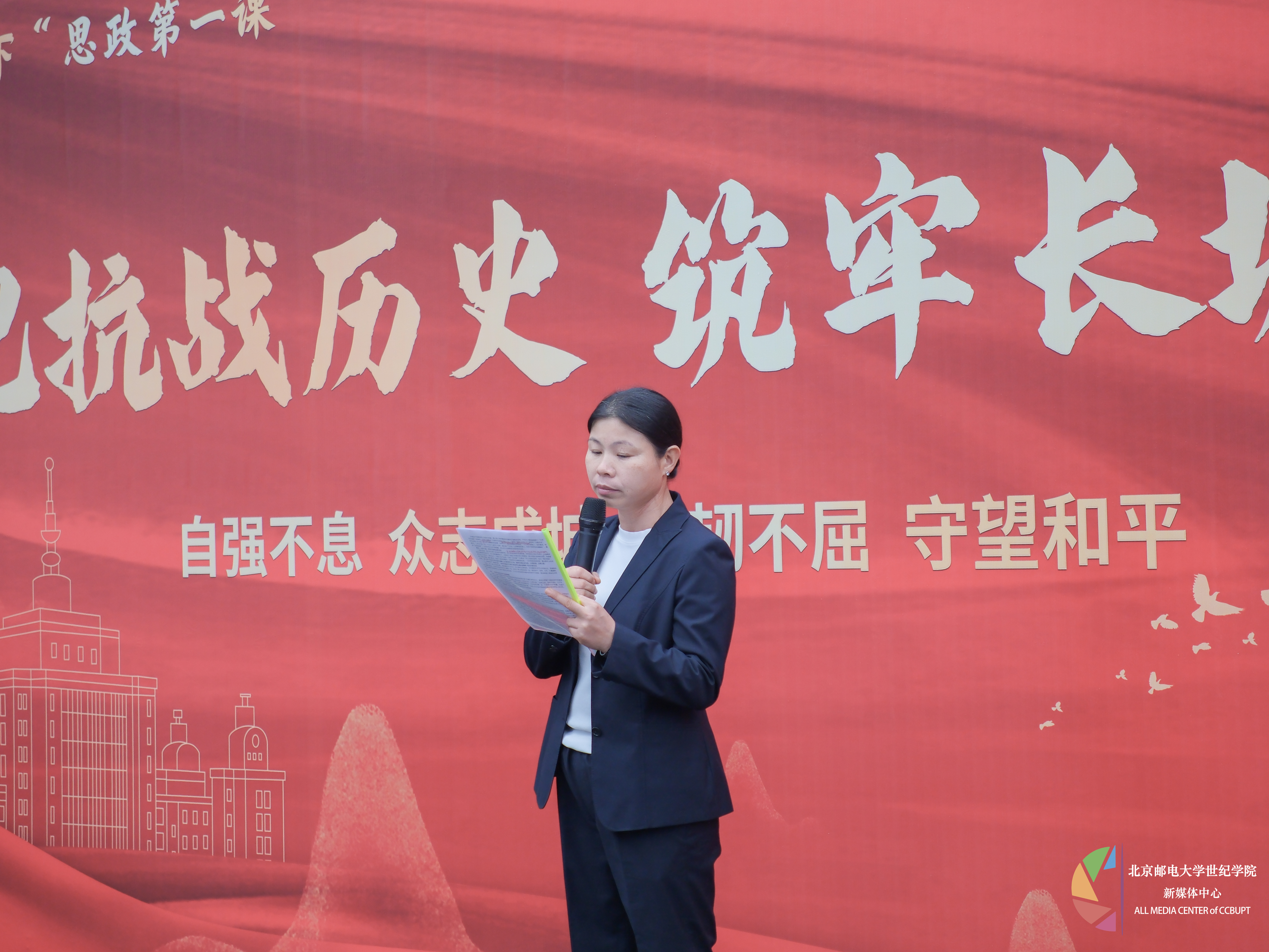 基礎教學部教師薛瑞英以熠熠生輝的抗戰精神為指引,深情回望那段烽火歲月,帶領現場師生重溫先輩們浴血奮戰的壯舉,她以鏗鏘有力的號召點燃青年學子的家國情懷,呼吁學生做歷史記憶的守護者、發展振興的同行者、國際公平正義的捍衛者。