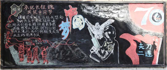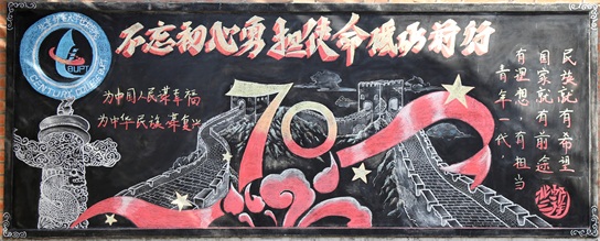男生三連的板報以長城為背景,紅色的絲帶連接著祥云和70周年的標志,左下角畫著一個立體的華表,華表上方是學院的校徽,板報的主題是“不忘初心,勇?lián)姑频Z前行”。寓意著北郵世紀精神與中華民族偉大復興的目標高度統(tǒng)一與融合。