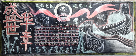 女生四連板報標題為“盛世華章”,板報以國徽絲帶,竹子長城和和平鴿構(gòu)成,紅絲帶上方寫著四連的口號:“風雨無阻,耀我四連”,表達了熱愛國家與向往和平的情懷。
