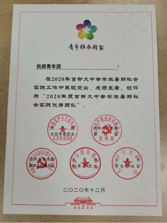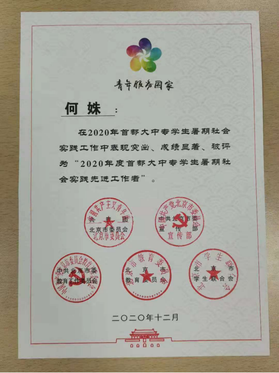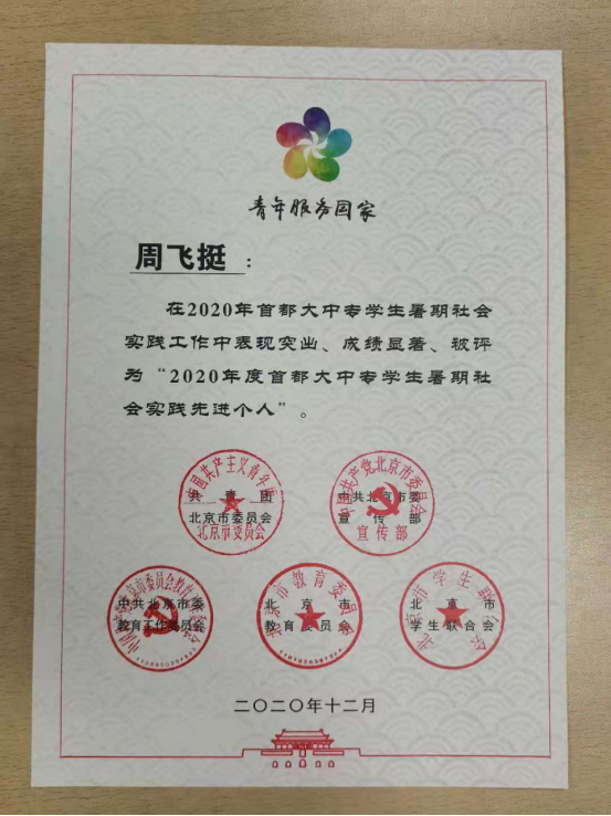 由共青團(tuán)北京市委員會(huì)、中共北京市委宣傳部、中共北京市委教育工作委員會(huì)、北京市教育委員會(huì)、北京市學(xué)生聯(lián)合會(huì)聯(lián)合開展的2020年首都大中專學(xué)生暑期社會(huì)實(shí)踐工作評(píng)選結(jié)果揭曉。我院“抗疫青年團(tuán)”團(tuán)隊(duì)榮獲“2020年‘青年服務(wù)國(guó)家’首都大中專學(xué)生暑期社會(huì)實(shí)踐優(yōu)秀團(tuán)隊(duì)”;團(tuán)委何姝老師榮獲“2020年首都大中專學(xué)生暑期社會(huì)實(shí)踐先進(jìn)工作者”;藝術(shù)與傳媒學(xué)院周飛挺同學(xué)榮獲“2020年首都大中專學(xué)生暑期社會(huì)實(shí)踐先進(jìn)個(gè)人”。