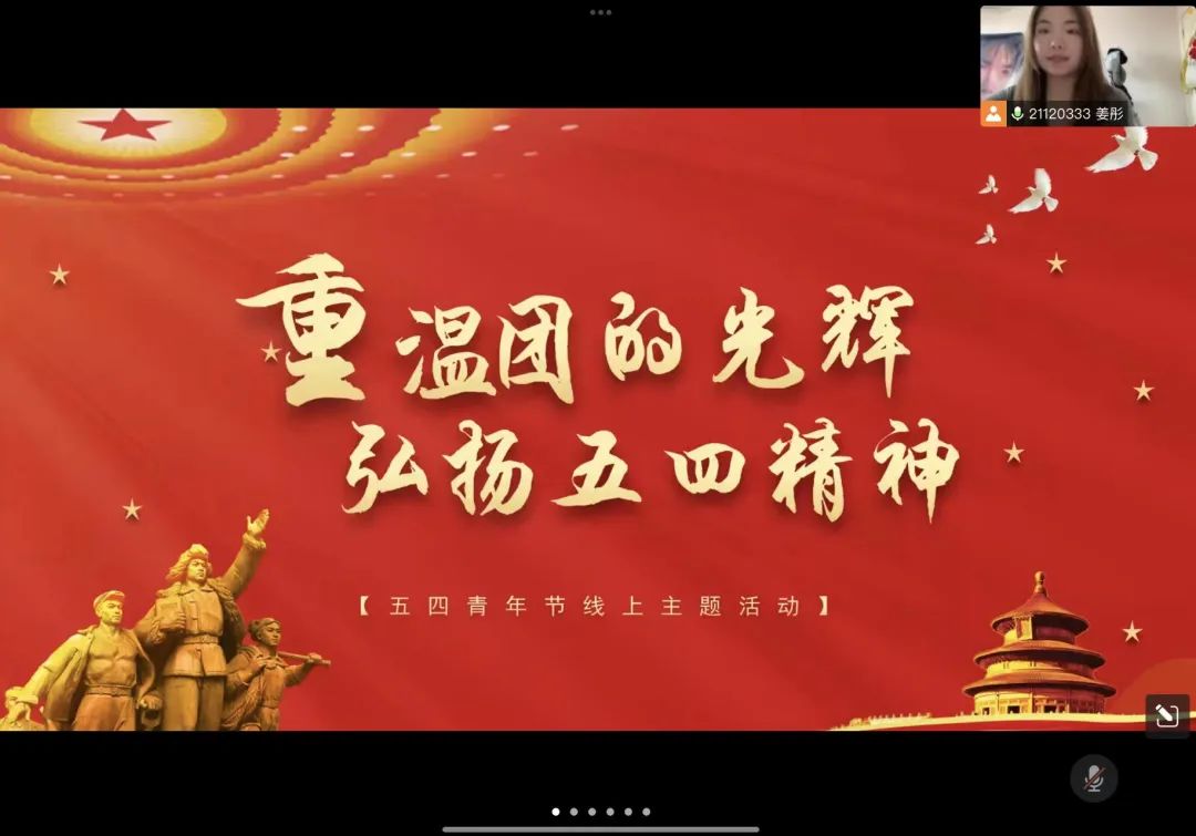 5月4日下午17:30,為認真貫徹落實科學發展觀,深刻理解新時代青年的使命擔當,藝術與傳媒學院學生黨支部組織開展“重溫團的光輝,弘揚五四精神”——五四青年節線上主題活動。參加本次活動的有藝術與傳媒學院學生黨支部、團總支書記趙鑫老師,輔導員朱孟娟老師、杜志超老師,新一批積極分子、團員,第二十四期黨校以及第十七期星火培訓班成員。