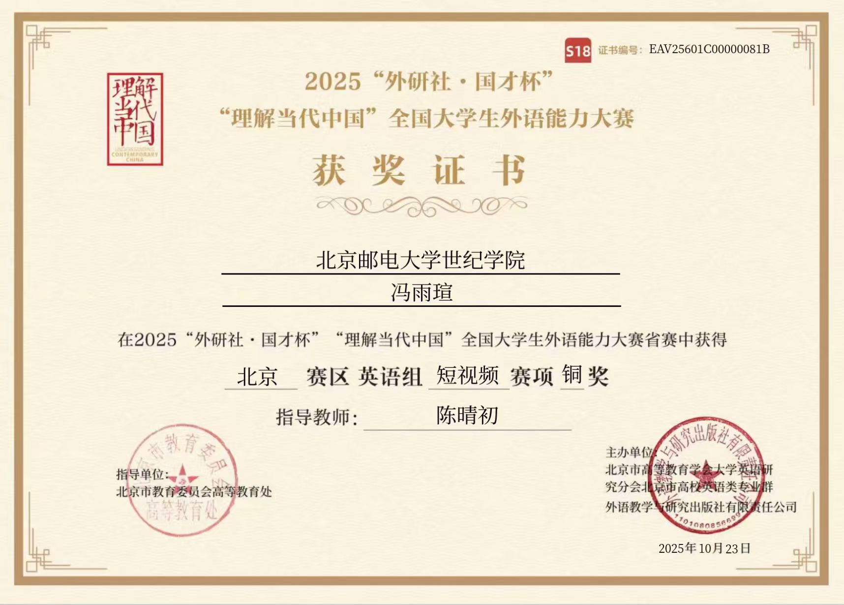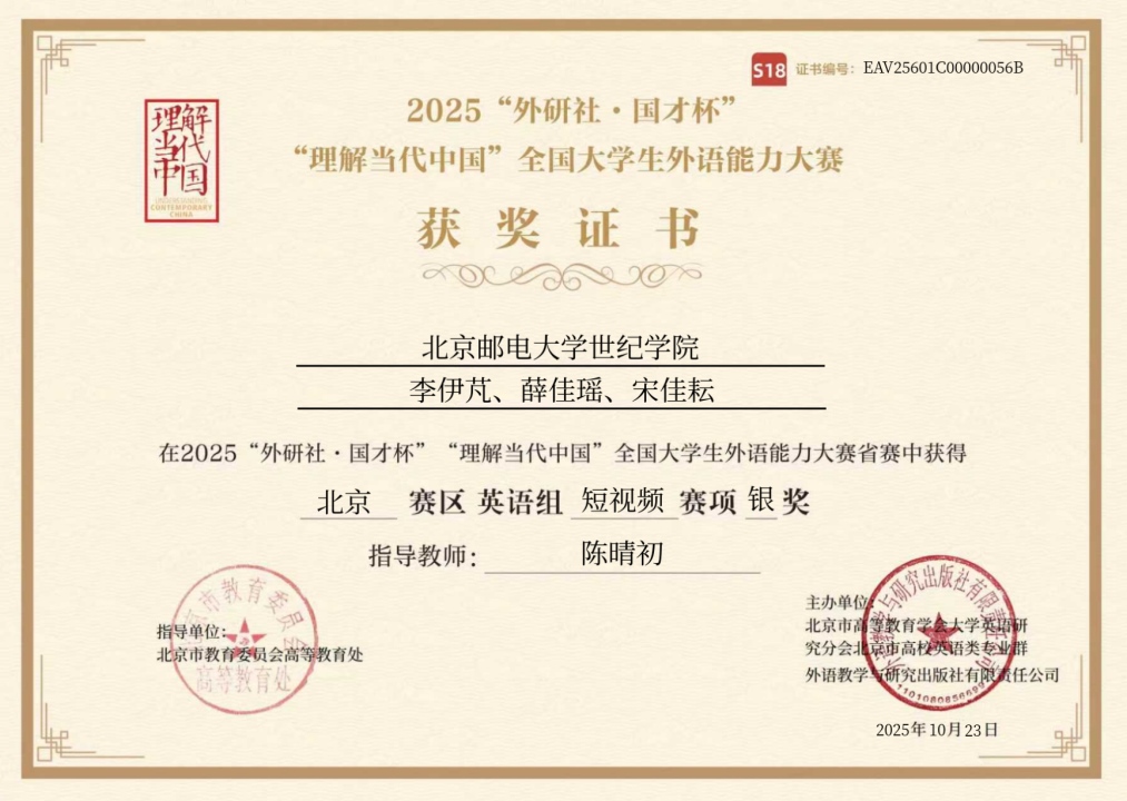 經過層層選拔與精心打磨,學院2024級數媒藝術專業周正鐳憑借獨特的視覺表達與深刻的主題詮釋,闡釋了新疆人民的韌勁,體現了“美麗中國”主題;2023級英語專業胡冬以流暢的英語表達與扎實的專業素養,將美麗中國的故事娓娓道來;由2023級英語專業王一丁與2023級傳播學專業趙梓伊組成的小組,充分發揮跨專業協作優勢,在視頻腳本創作與傳播視角呈現上亮點紛呈;2022級通信專業李伊芃、薛佳瑤、宋佳耘憑借默契的團隊配合與完整作品呈現,展現出學院學子的團隊協作能力與創新精神。2024級財務管理專業馮雨瑄也憑借出色的表現,獲得北京賽區銅獎,為學院贏得榮譽。