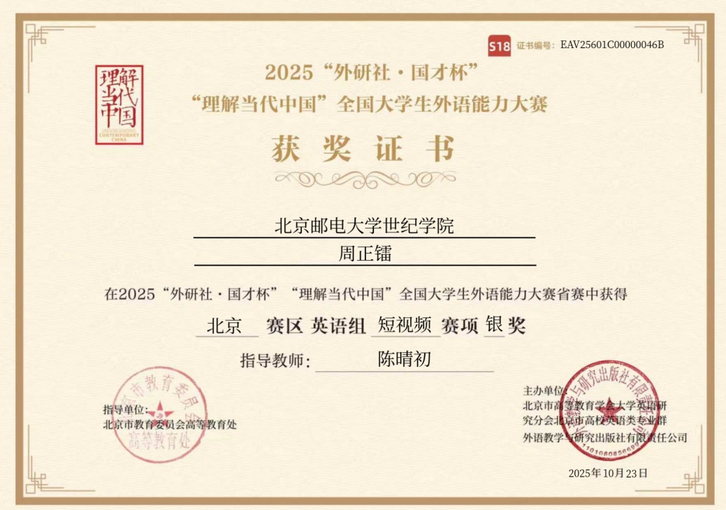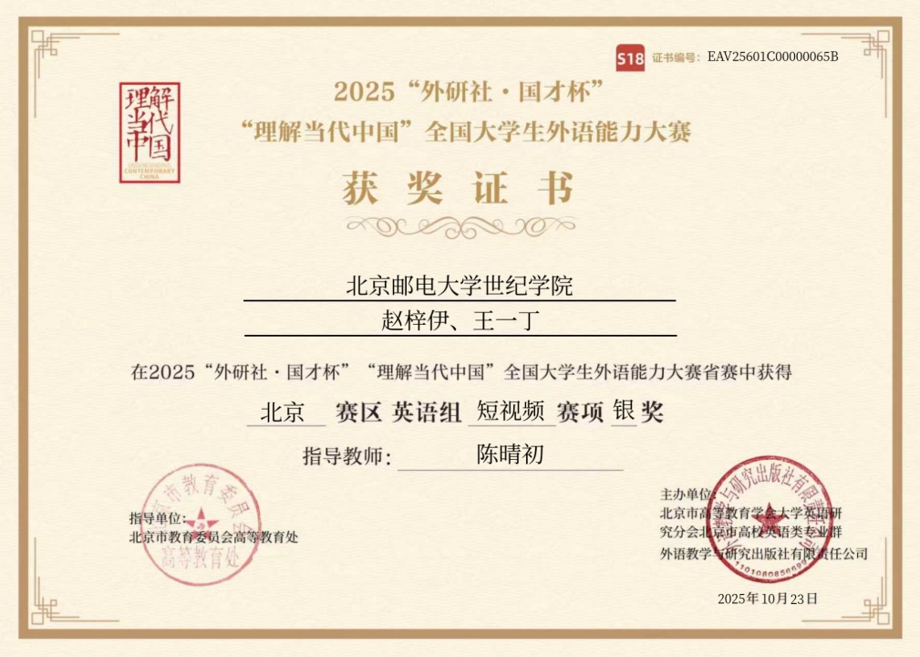 近日,2025 年“外研社?國才杯”“理解當代中國” 全國大學生外語能力大賽北京賽區短視頻大賽結果正式揭曉,學院學子憑借扎實的外語功底、新穎的創作思路和出色的綜合能力在眾多參賽隊伍中脫穎而出,4組選手成功斬獲北京賽區銀獎,1組選手獲得北京賽區銅獎,實現了歷史性突破,創下學院參賽以來的最佳成績。