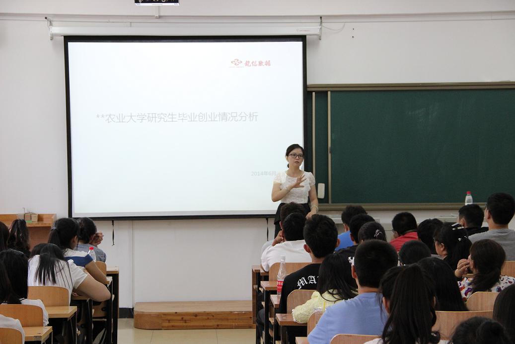 2014年8月19日13:30,來自龍信思源有限公司的董事副總裁姜春玲女士于學思樓103教室帶來一場主題為“農業大學研究生畢業創業情況分析”以及“大數據時代的高等教育”的講座。作為面向2014級經濟管理系市場營銷、電子商務專業學生的首場講座,經管系副主任師蕾,輔導員陳艷、樊洋、卜佑玲與2014級新生一同到場學習。