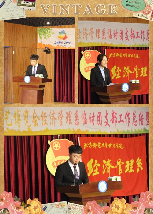 隨后,王然學長對志愿服務工作的總結讓我們回憶起世園會志愿的點點滴滴。過去半年,經濟管理系臨時團支部2019年1月底開始招募志愿者,3月中旬組織禮儀形象等相關培訓。自2019年4月12日踏勘,累計342名志愿者參與2019年世界園藝博覽會志愿服務活動,志愿者年級從2015級-2019級皆有涉及,涉及群眾、團員及黨員,其中學生黨支部所有黨員及預備黨員全部參與世園會志愿服務,志愿者參與人次達2384人次。其中宣傳組推出16篇專題推送,園內外舉辦特色活動11次。“世紀經管,助力世園,勵行篤志,芳華不染”是我們的口號也是我們的愿景。志愿服務結束,我支部志愿者們成長了很多,也收獲了很多,感謝學院給予我們一次難忘的經歷,感謝世園會世園局各位老師領導的支持。