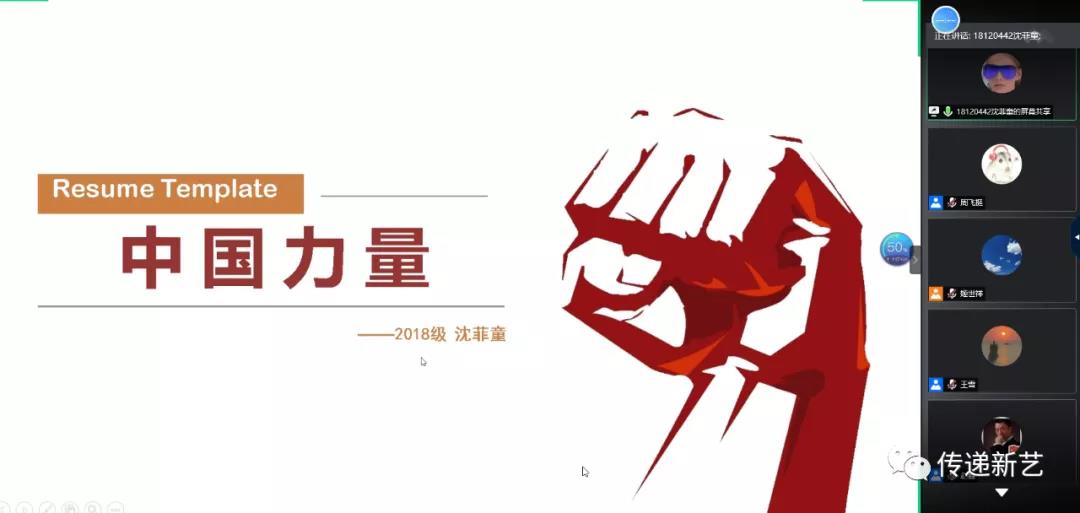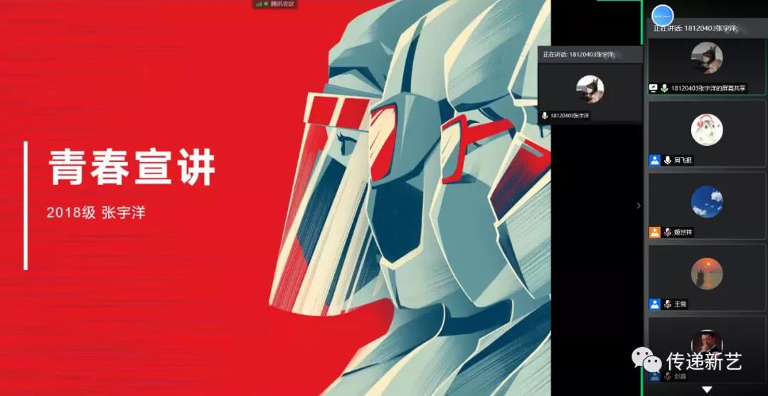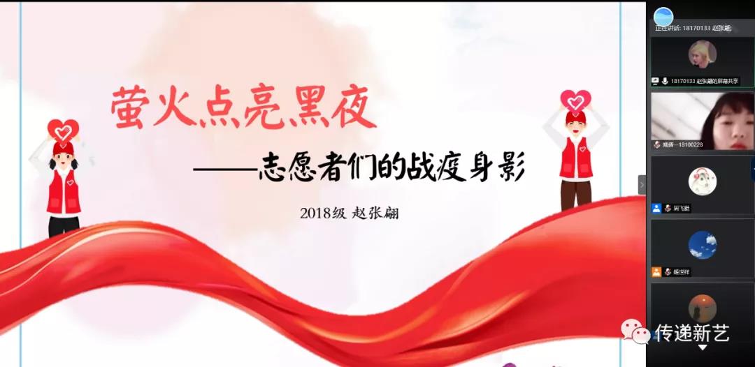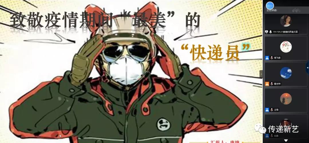2019級藝術1班陳笑語同學的《戰疫中的青春之歌》,講述抗疫中用激情所奏響的青春樂章;2017級傳播2班高敏瑞同學以《中流擊楫,醫者仁心》為題,借助一張張照片,展現了疫情下醫護人員們的不懼風險與善良,和中醫藥在抗疫中所發揮的重要作用;2018級藝術4班沈菲童同學帶來《疫情下的中國力量》,極大宣傳了我國的制度優勢,展現中國力量;2019級傳播1班唐婕同學的《致敬疫情期間“最美的快遞員”》、2018級傳播一班趙張翩的《螢火點亮黑夜—志愿者們的戰役身影》和2018級藝術4班張宇洋《火神山的軍人》都紛紛贊美奮戰在一線的所有參與者,軍人、快遞員、社區工作者、志愿者等,2018級傳播2班周飛挺同學《身后的戰士—恩師難忘》則向大家講述了北郵世紀學院的老師們在疫情期間為學生所付出的點點滴滴,上網課、信息統計、督促健康日報、特殊畢業“寄”行李打包等……宣講團成員們通過認真挖掘、宣傳疫情防控工作中涌現的生動案例、感人事跡,向全體同學闡釋我國制度優勢、增強制度自信。