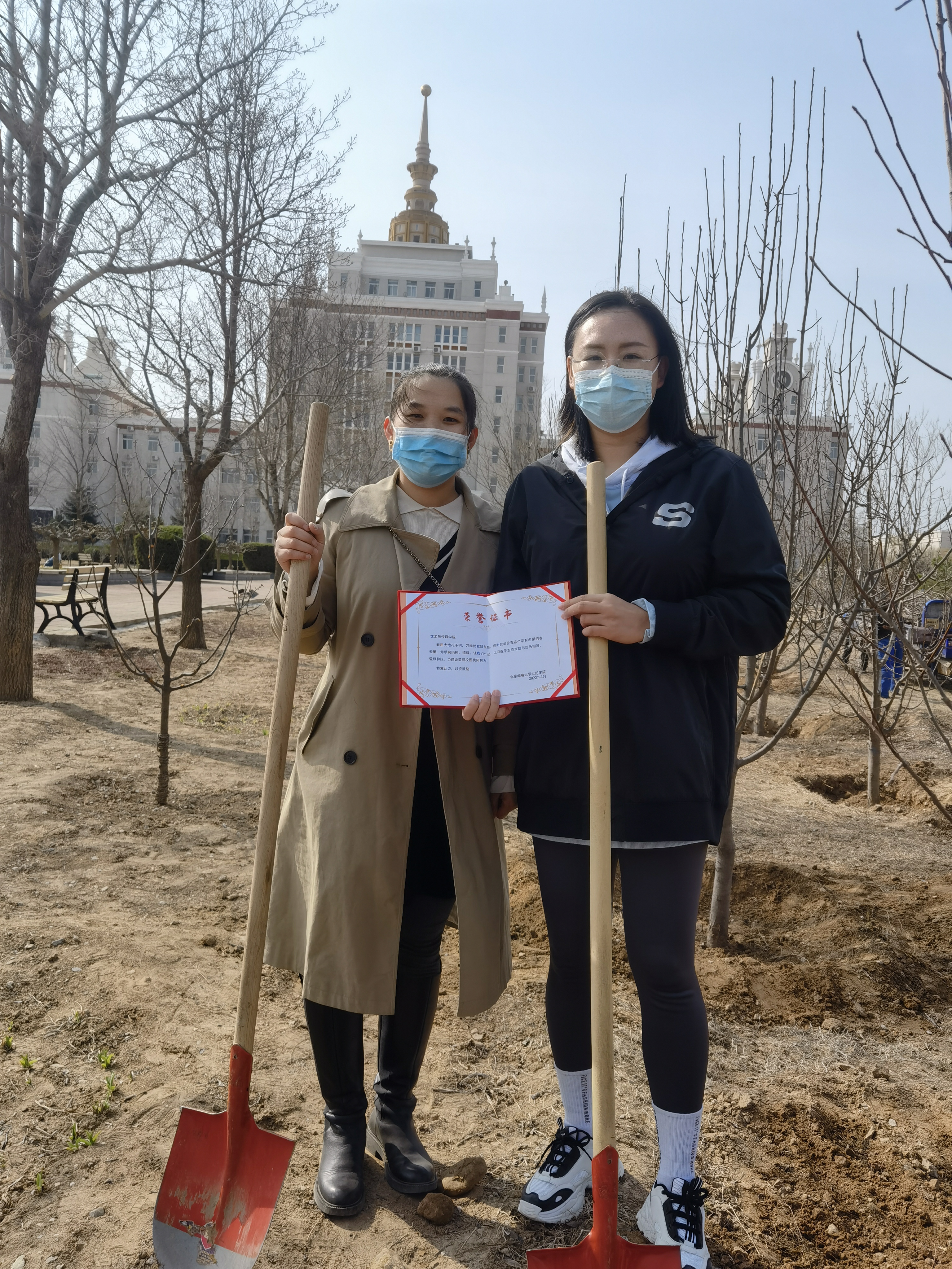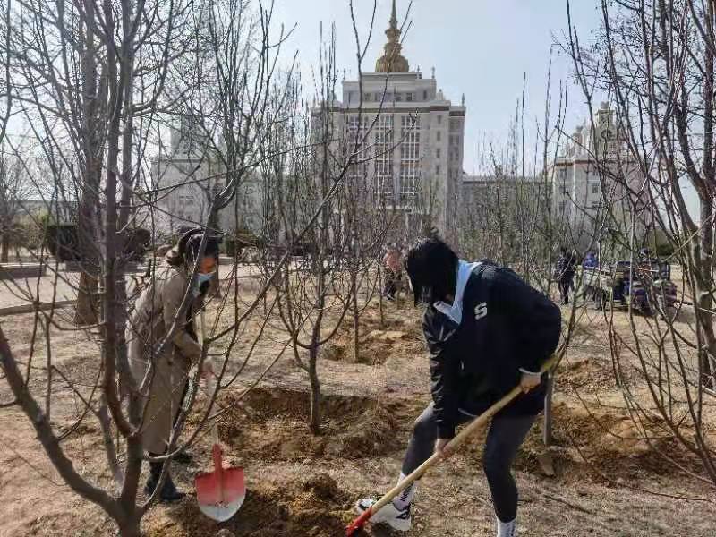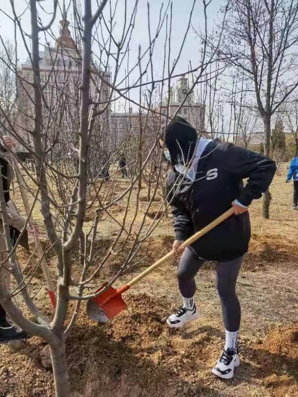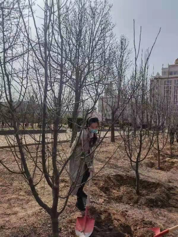 春時不待人,經向疫情防控領導小組報批且同意后。傳媒院輔導員胡桐彬、王雪2位老師代表師生植樹。她們分工合作,揮鍬鏟土、扶苗圍堰、提水澆灌等等。經過辛勤勞動,一棵棵樹苗在春風中佇立,期待它們的茁壯成長,為學院帶去新一年的綠意盎然和新的生機。