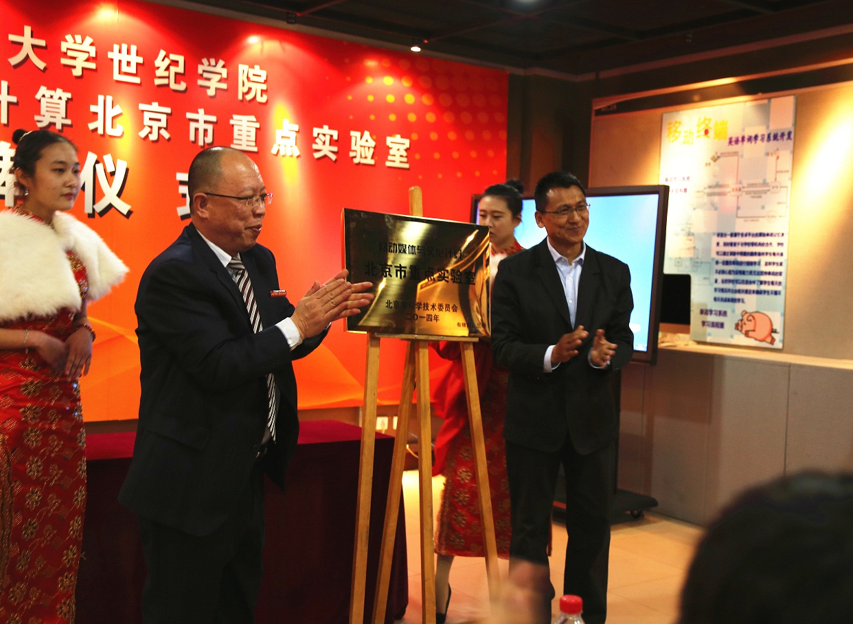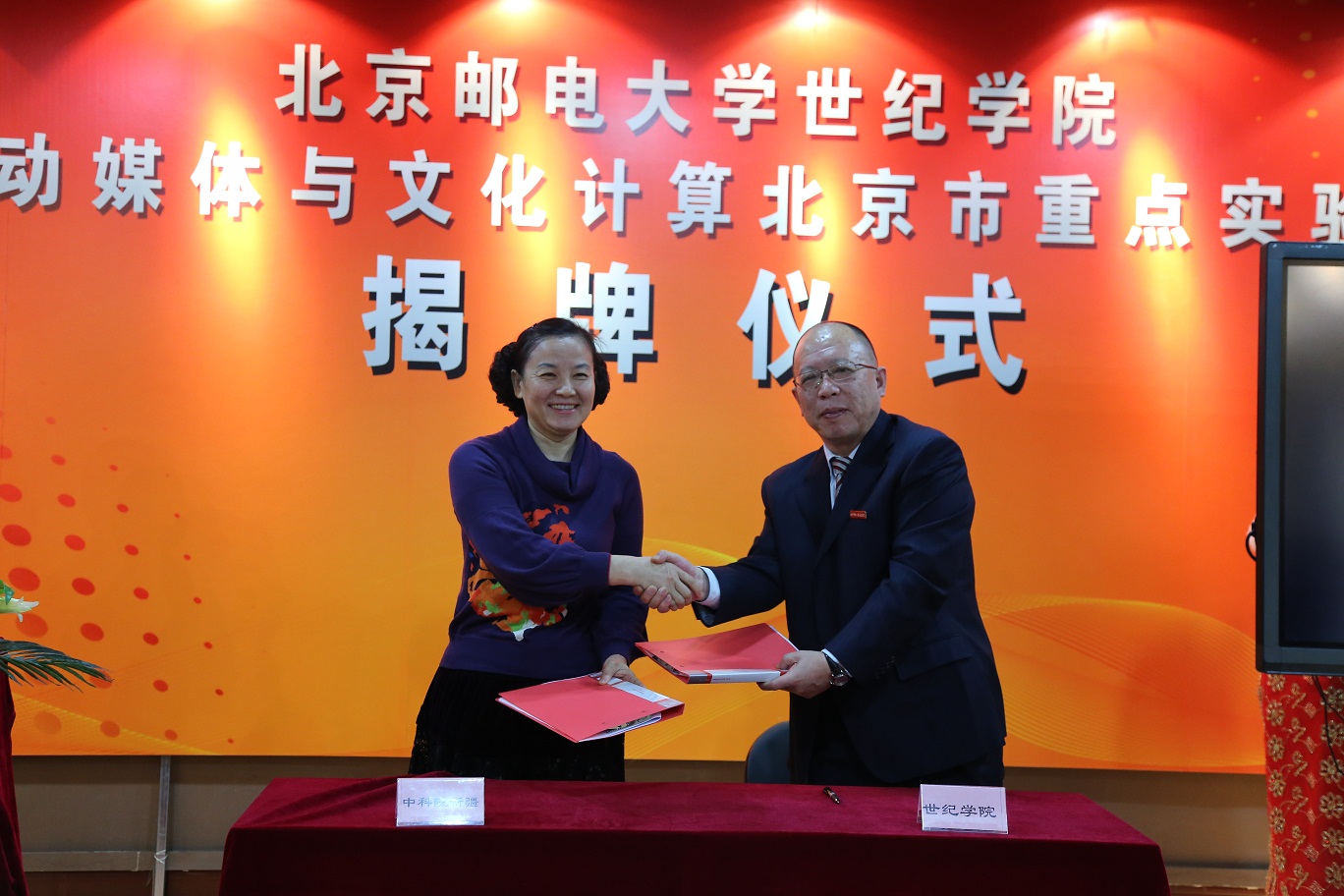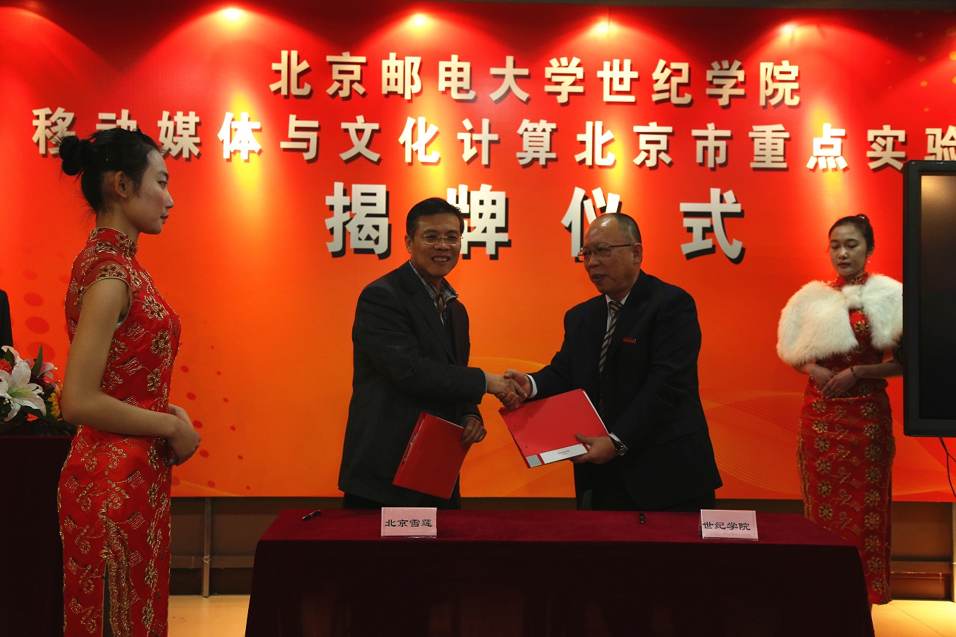 北京郵電大學世紀學院移動媒體與文化計算北京市重點實驗室揭牌儀式于2014年12月30日在北郵世紀學院舉行。北京市人大常委會教科文衛體委員會副主任委員顏振軍,北京市科委副處長董齊超,浙江大學教授彭群生等全國15位資深教授,北京郵電大學副校長、世紀學院院長李杰等領導出席儀式。顏振軍副主任與李杰院長共同為北京市重點實驗室揭牌。