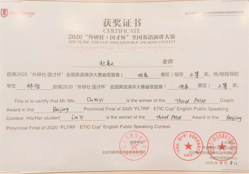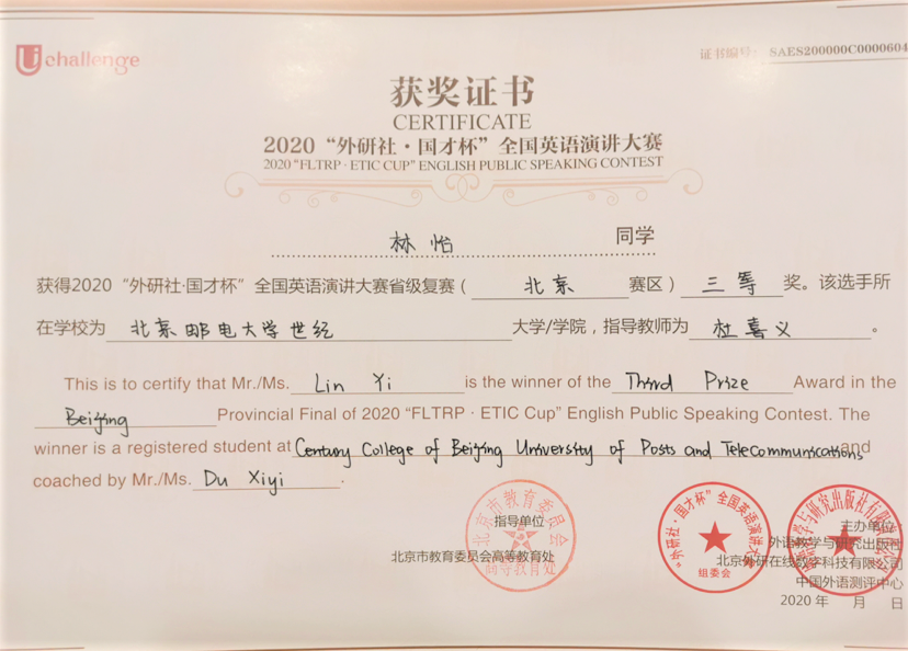 2020年11月8日,2020“外研社·國才杯”全國英語演講大賽北京賽區(qū)復(fù)賽在北京新世紀(jì)日航飯店舉行。本次比賽由2020年“外研社·國才杯”演講復(fù)賽北京賽區(qū)組委會主辦,北京市高教會大學(xué)英語研究會、北京林業(yè)大學(xué)外語學(xué)院承辦。學(xué)院2019級外語系英語專業(yè)學(xué)生林怡代表學(xué)院參賽,并獲三等獎(jiǎng)。