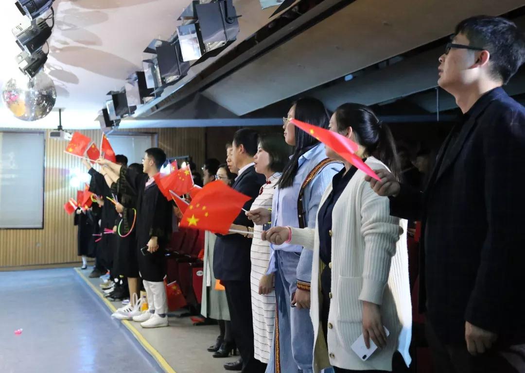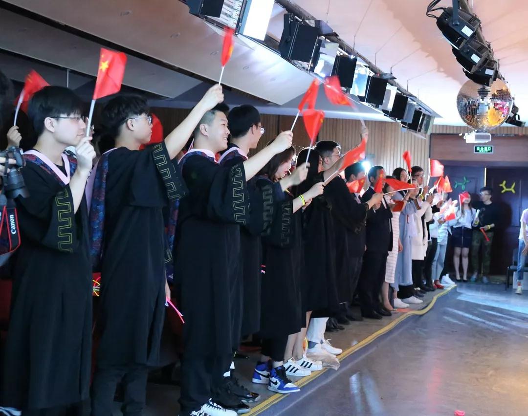 在晚會的最后,時逢新中國成立70周年,畢業生們身著學位服,手持五星紅旗,齊聲高唱《我和我的祖國》、系歌《綻放》等歌曲,以此表達愛國榮校之情。在相聚的日子里,有著最珍貴的情誼;在年輕的歲月中,有著最真摯的相知。