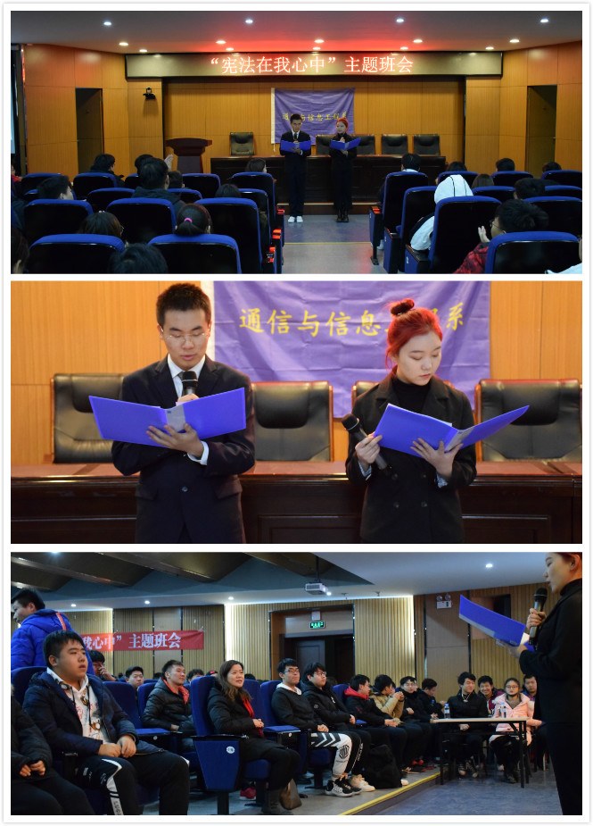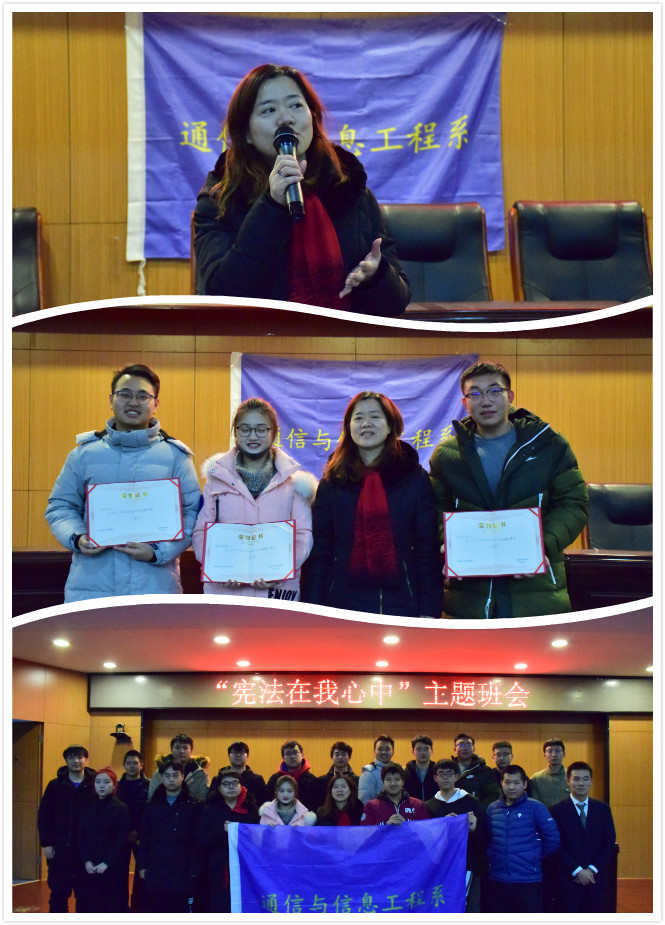 在我國第六個國家憲法日到來之際,為弘揚(yáng)憲法精神,樹立憲法權(quán)威,通信與信息工程系2018級通信工程1-5班、電子信息1班于12月3日晚上18:00,在學(xué)思樓229召開了“憲法在我心中”主題班會,輔導(dǎo)員聶斌老師蒞臨了本次活動。