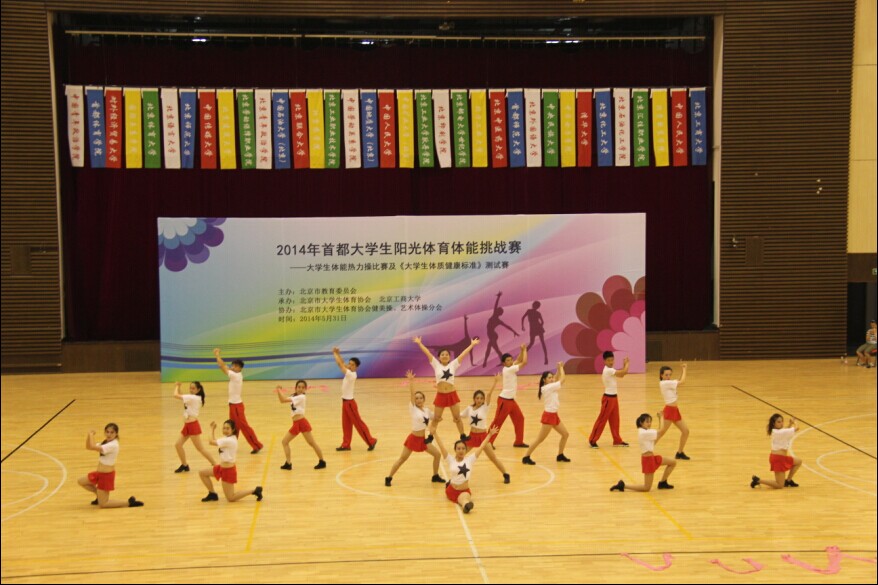 2014年5月31日,由北京市教育委員會(huì)主辦的“2014年首都大學(xué)生陽光體育體能挑戰(zhàn)賽、大學(xué)生體能熱力賽及《大學(xué)生體質(zhì)健康標(biāo)準(zhǔn)》測(cè)試賽”在北京工商大學(xué)隆重舉行。由我院基礎(chǔ)教學(xué)部體育教研室全力打造的院健美操隊(duì)在覃超瑩老師的帶領(lǐng)下參加了體能挑戰(zhàn)賽,獲得了團(tuán)體三等獎(jiǎng)、熱力操三等獎(jiǎng)。本次大賽共有來自清華大學(xué)、北京大學(xué)、北京服裝學(xué)院等眾多高校參賽隊(duì)伍。我院代表隊(duì)以燦爛的微笑、整齊有力的動(dòng)作、飽滿的精神贏得評(píng)委贊許的目光,并最終延續(xù)了傳統(tǒng),從各參賽隊(duì)中脫穎而出,再次取得好名次。