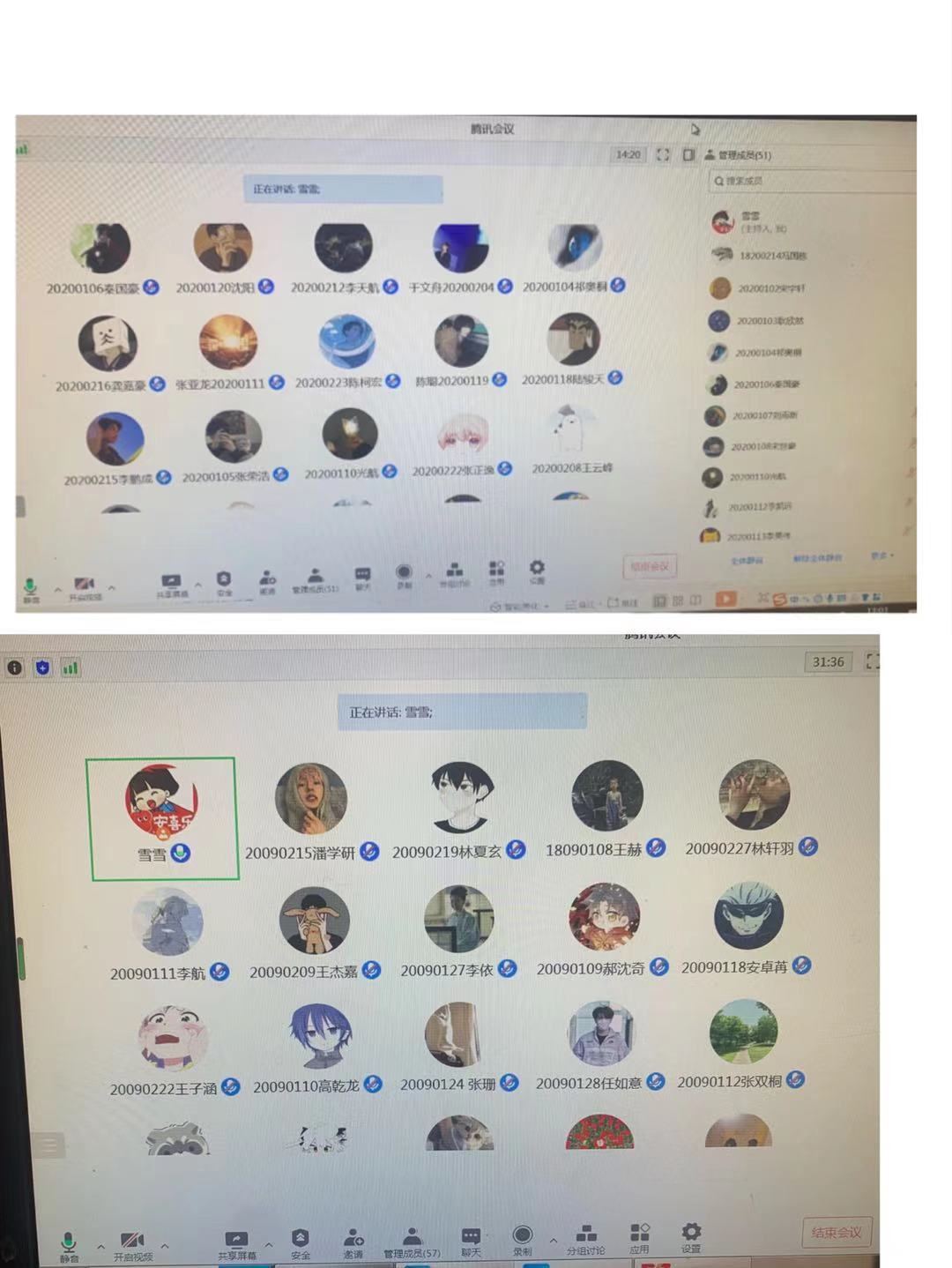 首先,閆雪老師邀請本專業在本學期科技創新、競賽、疫情防控、志愿服務等方面較突出的同學進行經驗分享,他們用實際行動在不同方面譜寫了青春的精彩。其次,閆雪老師從誠信備考角度分享了多個發生在同學們身邊的真實案例,要求同學們端正態度、誠信備考,用行動的力量為大二的學習生活畫下一個圓滿的句號。最后,閆雪老師就當前疫情防控做了強調,要求同學們遵守屬地要求,嚴格落實各項防疫政策。