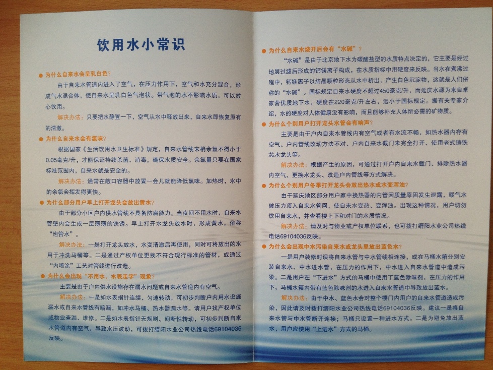 首先,區別于北京城區的自來水采用的是地表水,延慶縣市政供水采用的都是地下水,因此,康莊的自來水是沒有蓄水池釋壓這一環節,故水壓比較大,氣泡會比較多。而且,地下水水質是比地表水水質要好一些的。