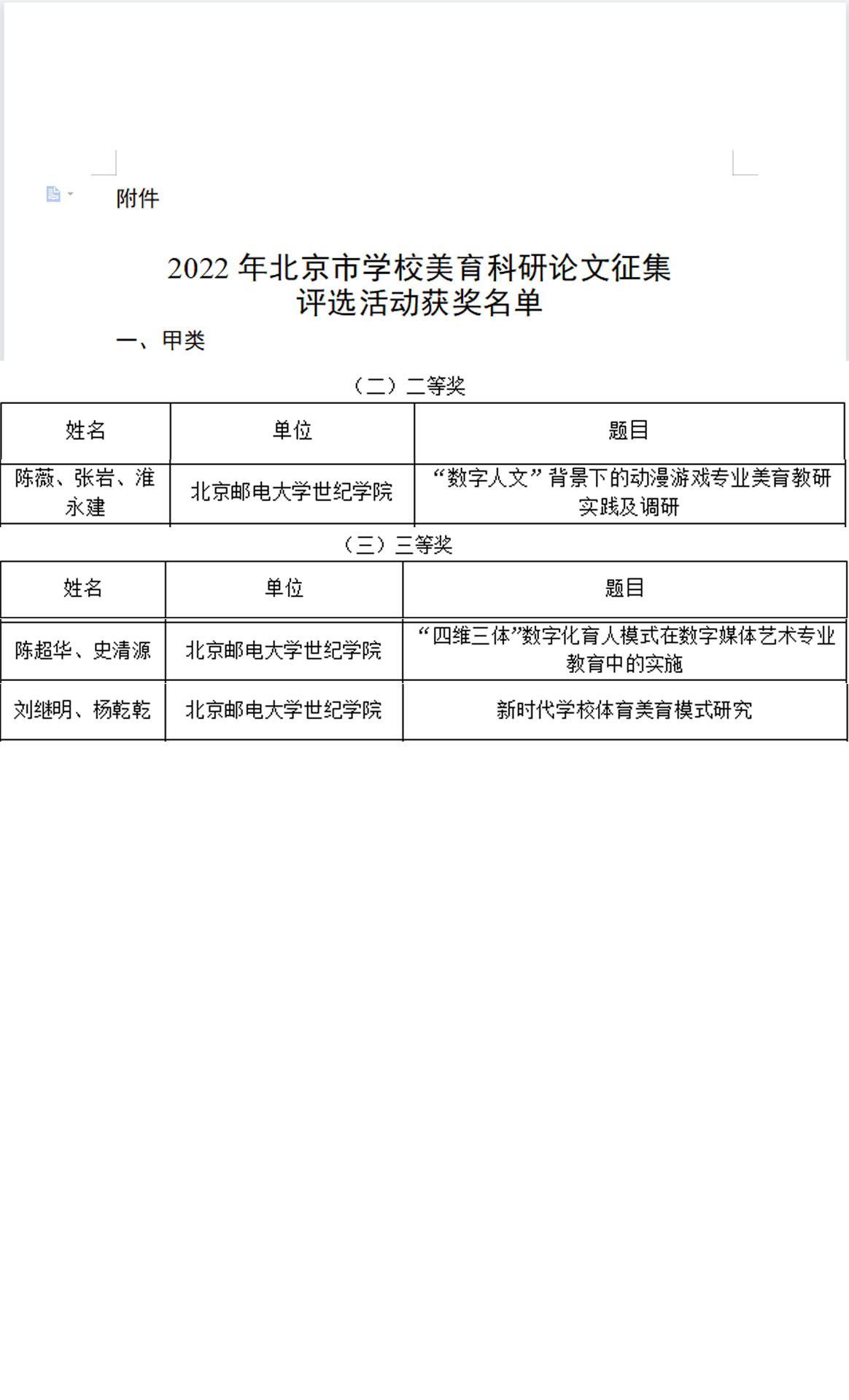 學(xué)院陳薇、張巖、淮永建老師論文《“數(shù)字人文”背景下的動(dòng)漫游戲?qū)I(yè)美育教研實(shí)踐及調(diào)研》榮獲甲類二等獎(jiǎng),陳超華老師論文《“四維三體”數(shù)字化育人模式在數(shù)字媒體藝術(shù)專業(yè)教育中的實(shí)施》,劉繼明、楊乾乾老師論文《新時(shí)代學(xué)校體育美育模式研究》榮獲甲類三等獎(jiǎng)。
