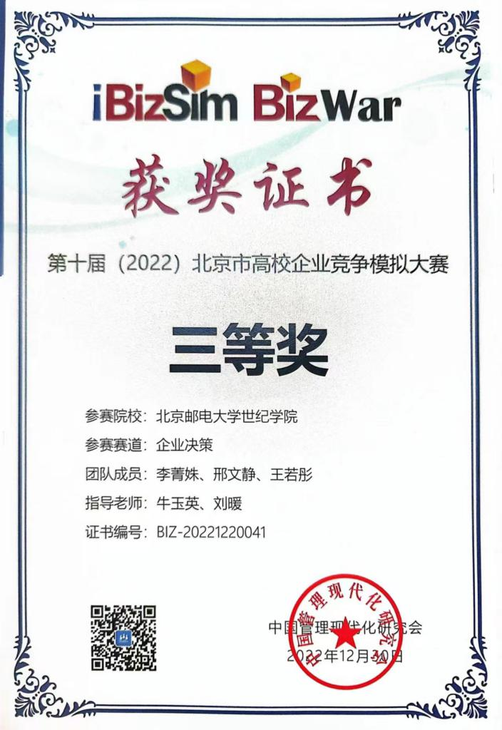 近日,第十屆(2022)北京市大學(xué)生企業(yè)競(jìng)爭(zhēng)模擬大賽落下帷幕。經(jīng)過(guò)初賽、復(fù)賽、決賽三個(gè)階段的比拼,學(xué)院8支隊(duì)伍共24名同學(xué)進(jìn)入決賽,最終獲得二等獎(jiǎng)6項(xiàng)、三等獎(jiǎng)2項(xiàng)。牛玉英、劉暖兩位老師為學(xué)生提供全程指導(dǎo)。