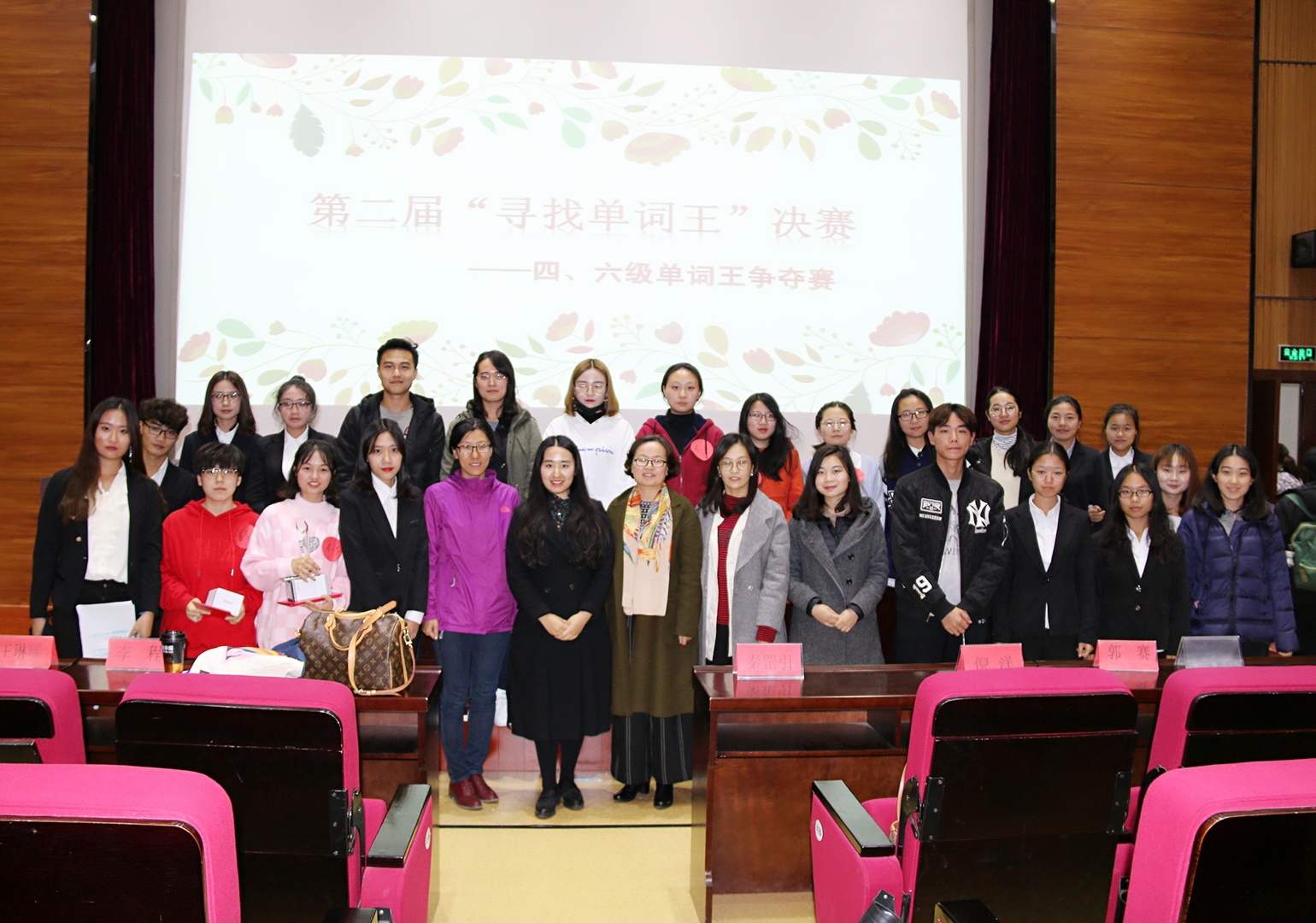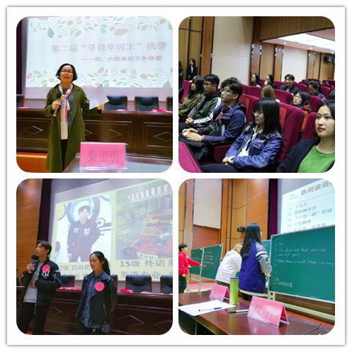 10月24日19:00,在大家的共同努力下,外語(yǔ)系第二屆“尋找單詞王”大賽決賽大獲成功,精彩紛呈!蒞臨決賽的領(lǐng)導(dǎo)、嘉賓及評(píng)委老師有:外語(yǔ)系主任秦罡引、主任助理倪洋、教師程呈、李程、王琳瑤,此次大賽的策劃者和組織者為郭賽老師,院團(tuán)委、各系副書(shū)記,以及外語(yǔ)系學(xué)生會(huì)主席。
