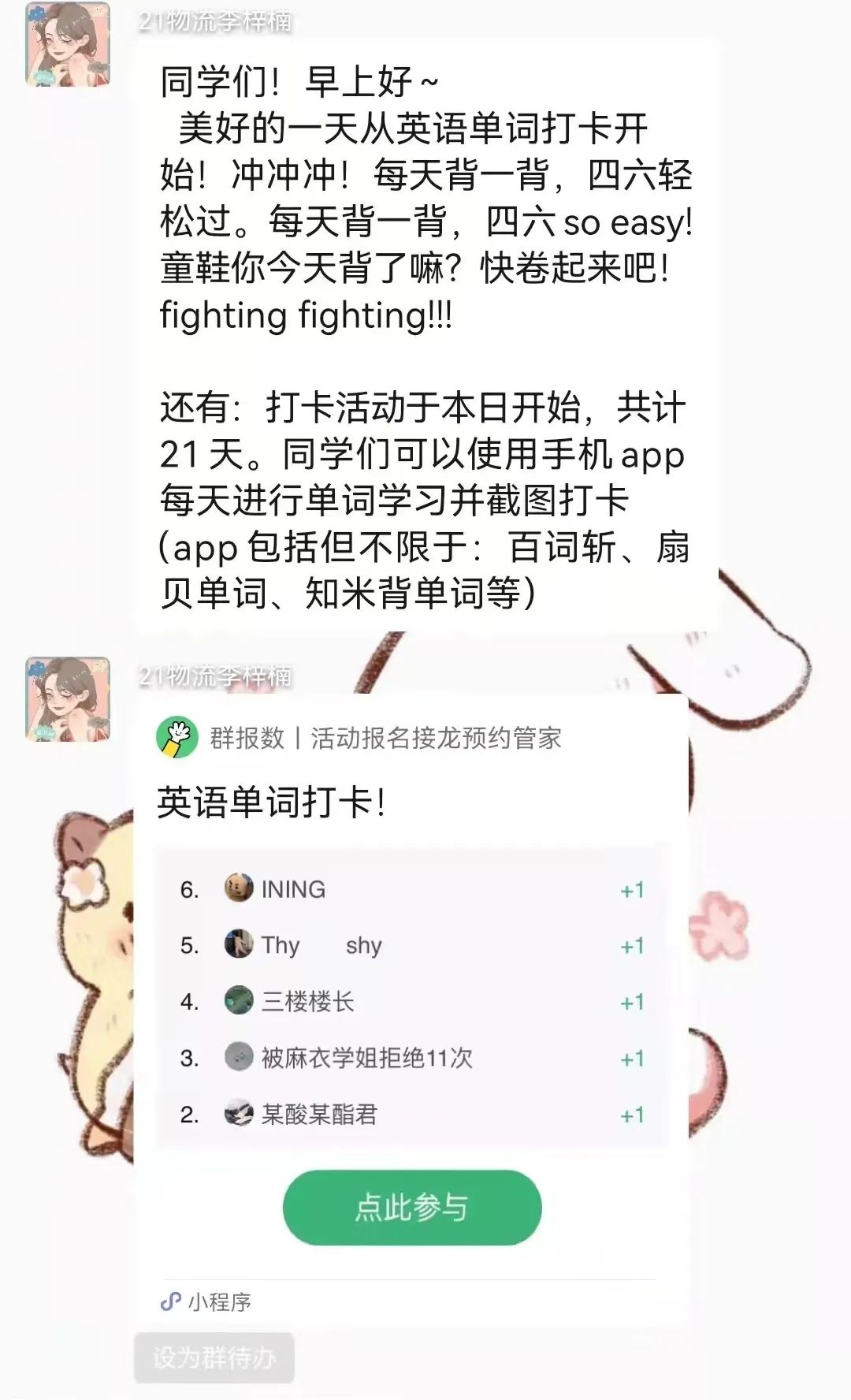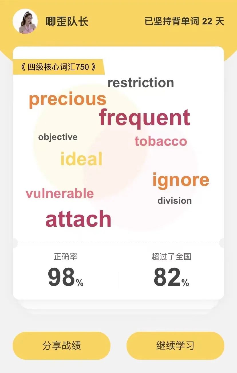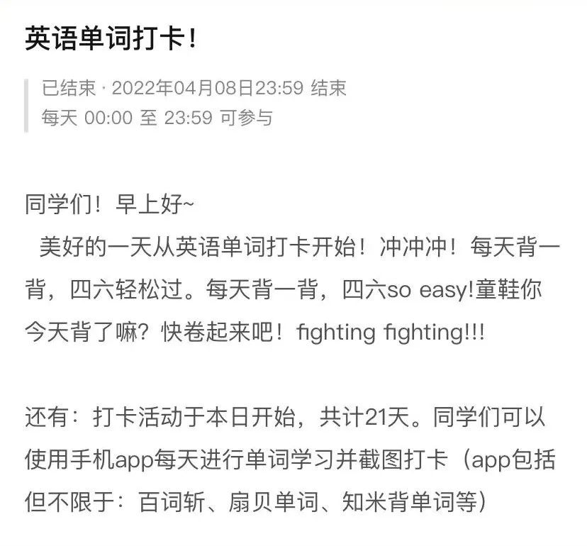 根據(jù)當(dāng)前線上學(xué)習(xí)模式,為督促學(xué)生養(yǎng)成良好學(xué)習(xí)習(xí)慣,提高學(xué)生英語學(xué)習(xí)熱情,鼓勵大家而在無人陪伴、無人監(jiān)督的情況下通過“云學(xué)習(xí)”方式提升英語能力,自動化系學(xué)習(xí)部近期舉辦“21天好習(xí)慣養(yǎng)成計(jì)劃——單詞打卡學(xué)習(xí)活動”,系內(nèi)同學(xué)積極參與。