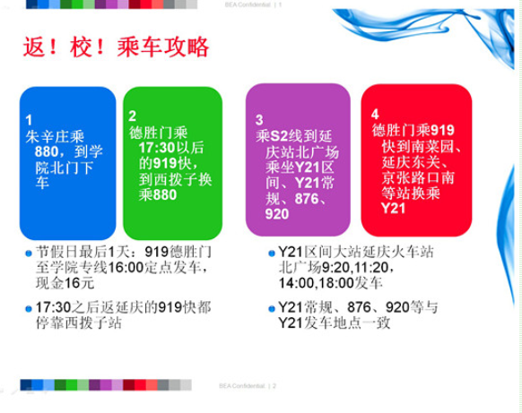 根據(jù)學生專線運營情況,為使師生出行更為便捷快速,經(jīng)我處與八方達延慶分公司溝通,從本周起,調整學生專線運行模式及時間,具體說明如下: