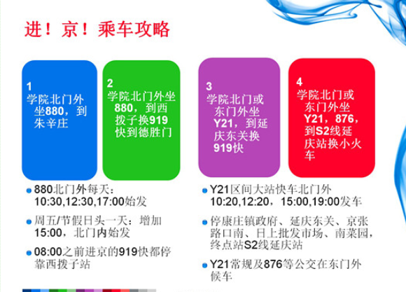 4、從八方達公司獲悉,每日8:00前進京以及17:30返延慶的919快公交均停靠西撥子站,如有需要,師生可在此下車轉880路公交。