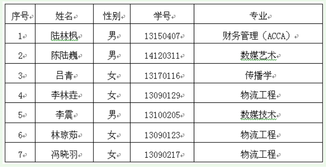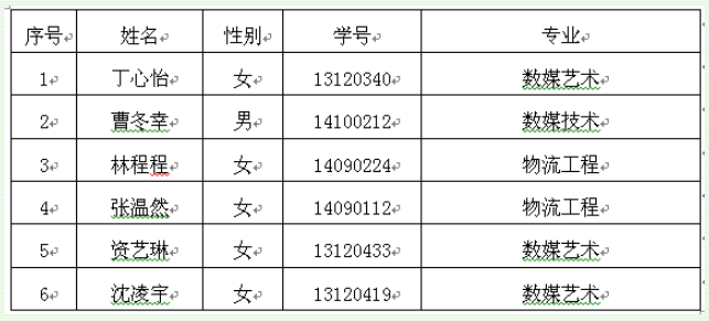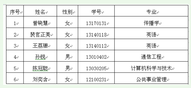 根據我院與國(境)外友好院校簽署的《關于教師和學生互換交流的教育合作協議》, 2015年11月19日,國際處、教務處本著公平、公正和公開的原則,對報名參加2016年春季學期校際交換生項目學生進行了面試。根據學生學業平均加權成績、外語口試成績、文化素養等綜合能力進行測評和考核,現對選拔結果進行公示: