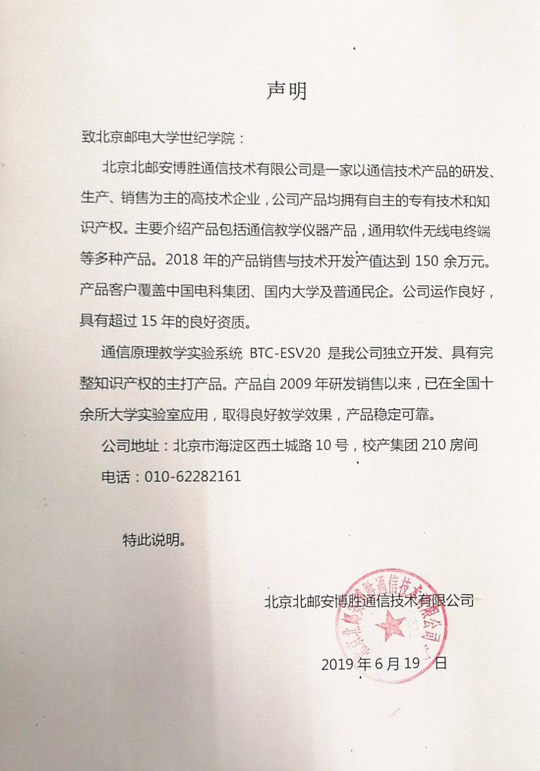 北京郵電大學(xué)世紀(jì)學(xué)院通信系申請“通信原理實(shí)驗(yàn)系統(tǒng)”采用單一來源方式采購,擬由北京北郵安博勝通信技術(shù)有限公司供給,具體產(chǎn)品技術(shù)指標(biāo)為: