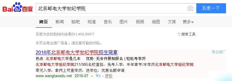 近日,廣大學(xué)生家長(zhǎng)及關(guān)心我院發(fā)展的社會(huì)各界朋友致電反映:在百度搜索欄輸入“北京郵電大學(xué)世紀(jì)學(xué)院”、“北郵世紀(jì)學(xué)院”、“世紀(jì)學(xué)院”關(guān)鍵詞時(shí),發(fā)現(xiàn)彈出的首條信息為某成人招考網(wǎng)站的商業(yè)推廣信息,如下圖搜索截屏所示: