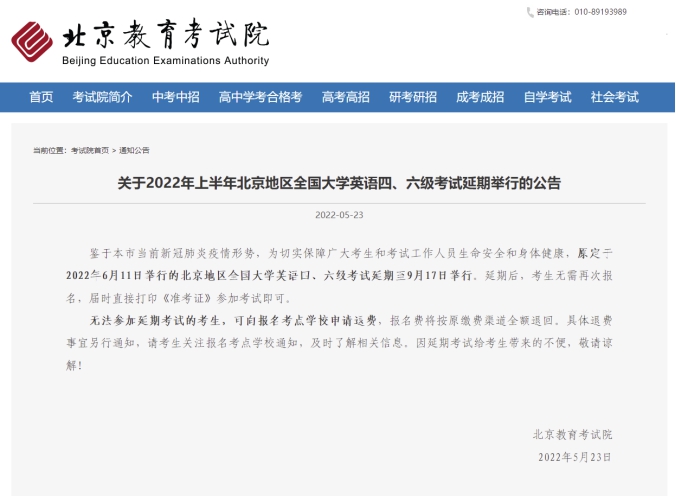 接北京教育考試院通知,鑒于北京市當前新冠肺炎疫情形勢,為切實保障廣大考生和考試工作人員生命安全和身體健康,原定于2022年6月11日舉行的北京地區全國大學英語四、六級考試延期至9月17日舉行。延期后,考生無需再次報名,屆時直接打印《準考證》參加考試即可。無法參加延期考試的考生,可向學院申請退費,報名費將按原繳費渠道全額退回。具體退費事宜另行通知,請考生關注學院通知,及時了解相關信息。因延期考試給考生帶來的不便,敬請諒解!